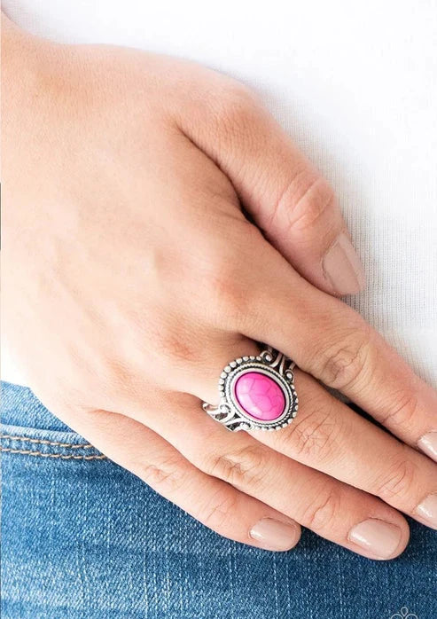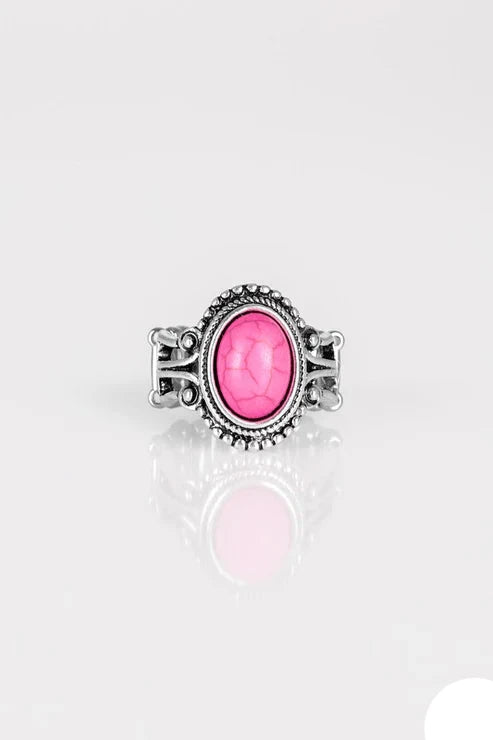 A vivacious pink stone is pressed into the center of a silver band radiating with silver studs for a seasonal look. Features a stretchy band for a flexible fit. Sold as one individual ring.