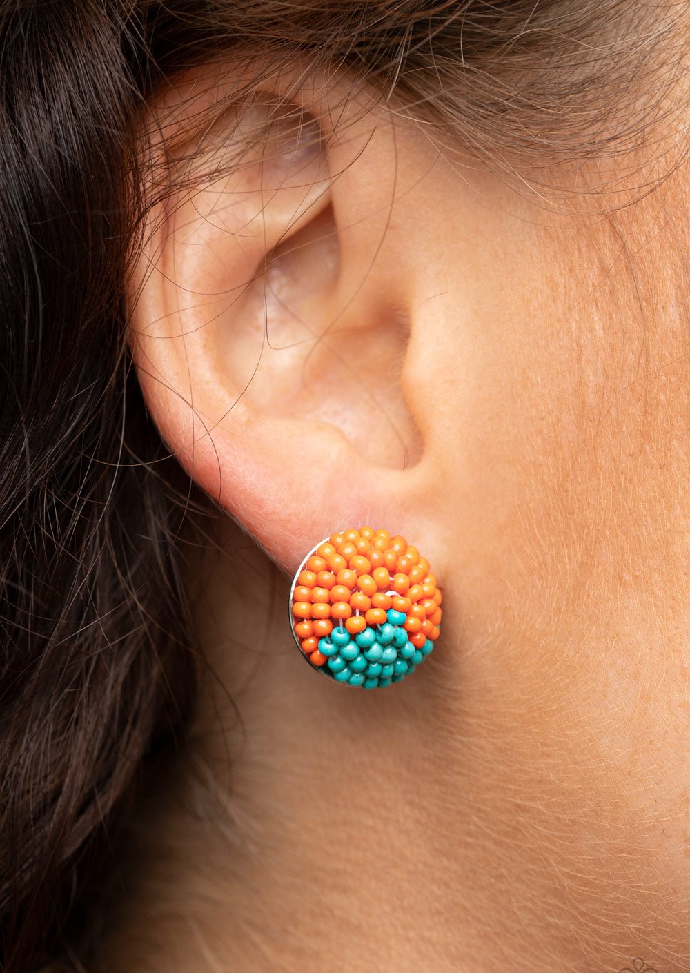A dainty collection of Amberglow and turquoise seed beads embellished the front of a circular frame, creating a colorful half and half pattern. Earring attaches to a standard post fitting.