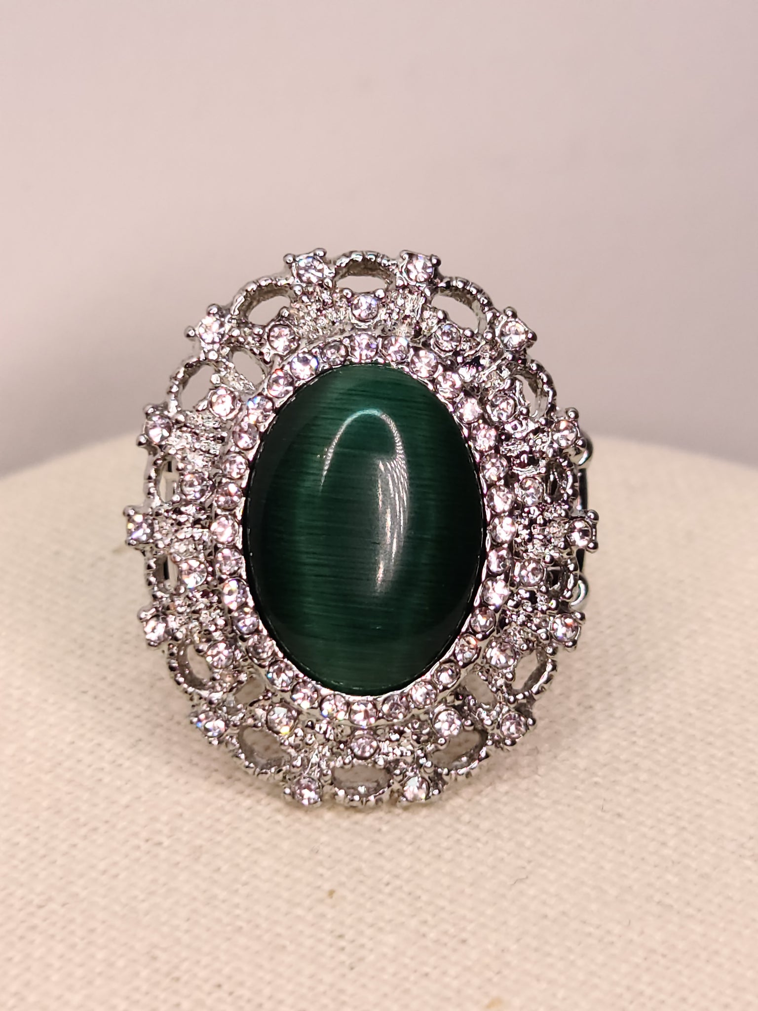 A glowing green cat's eye stone nestles inside of a frilly floral frame dotted with dainty white rhinestones and delicate antiqued details. Features a stretchy band for a flexible fit.