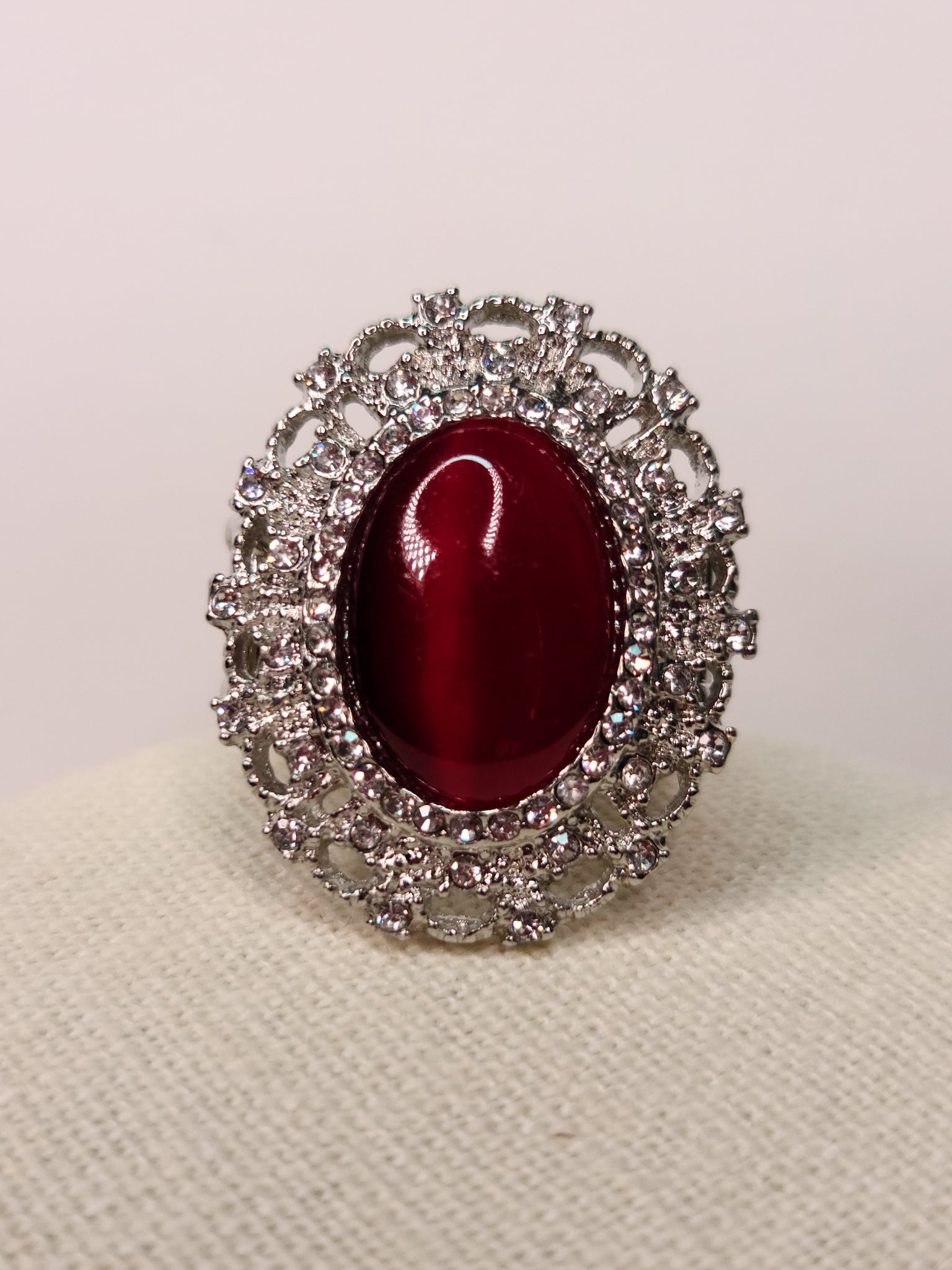 Shimmery silver filigree delicately gathers around a dewy red cat's eye stone, creating a whimsical centerpiece atop the finger. Features a stretchy band for a flexible fit.