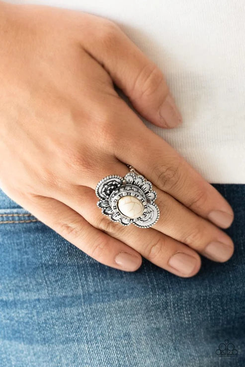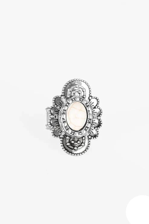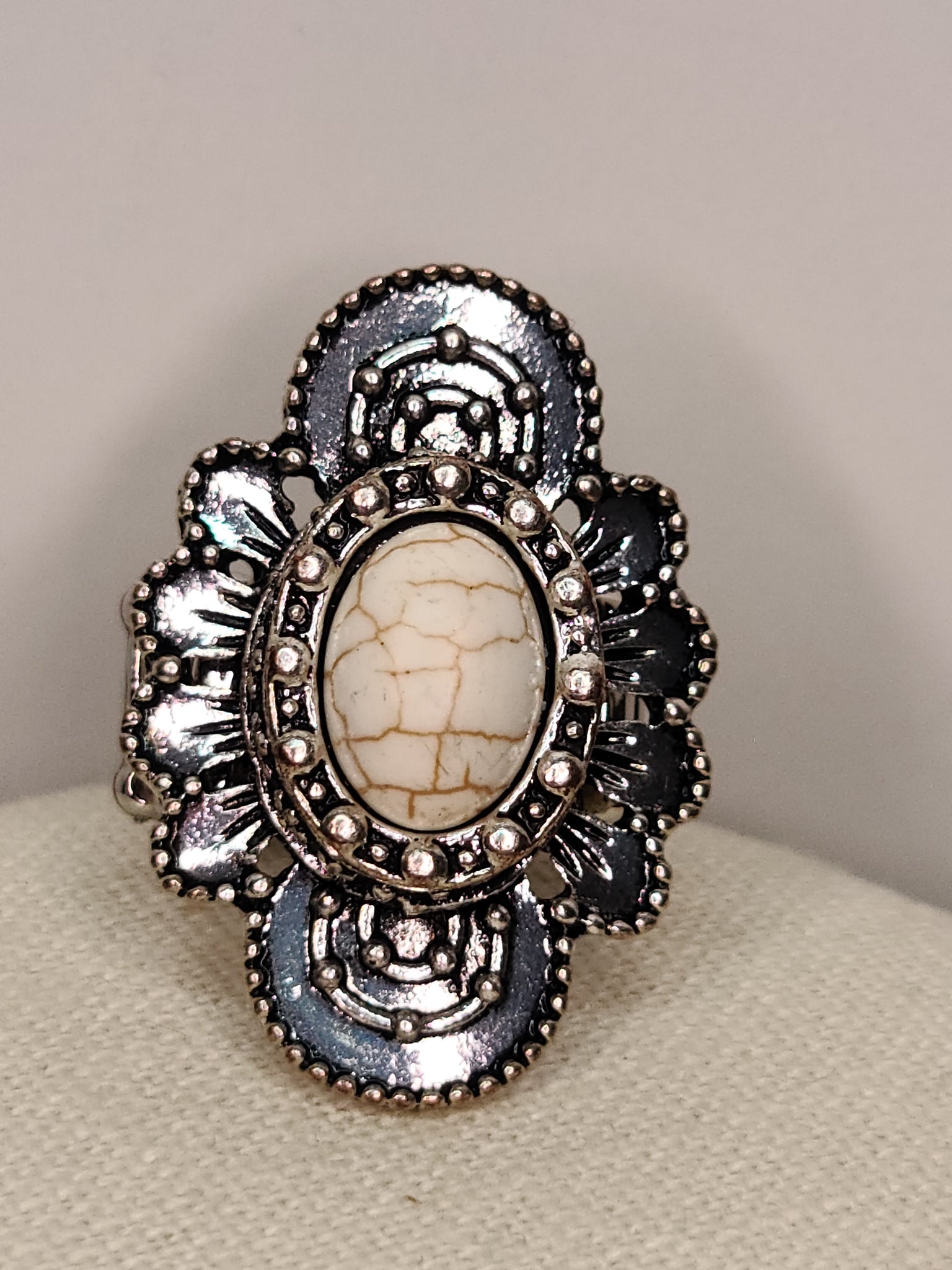 Ivory sand stone is pressed into a detailed silver frame. Features a stretchy band for a flexible fit.