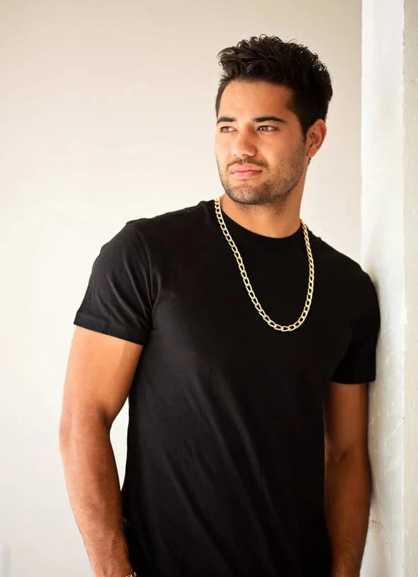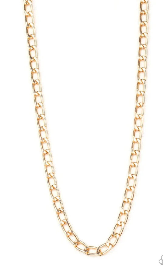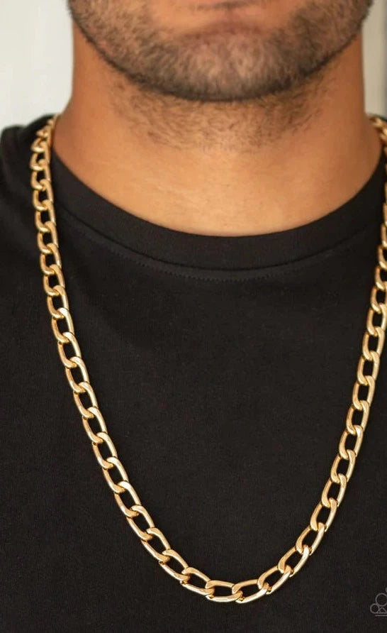 A thick GOLD beveled cable chain drapes across the chest for a classic look. Features an adjustable clasp closure.