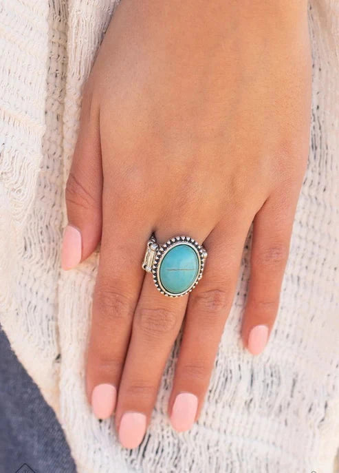 Chiseled into a smooth oval, a refreshing turquoise stone is pressed into the center of a studded silver frame for an artisan inspired look. Features a stretchy band for a flexible fit. Sold as one individual ring.