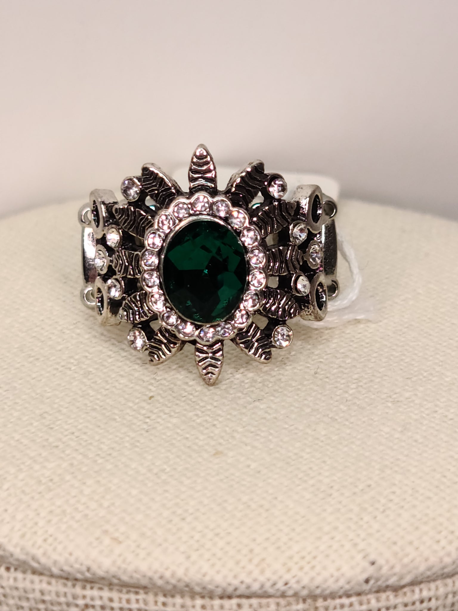 Ringed in glittery white rhinestones, a glittery green gem is pressed into the center of a leafy silver frame. Dainty white rhinestones are sprinkled along the shimmery foliage for a refined finish. Features a stretchy band for a flexible fit.