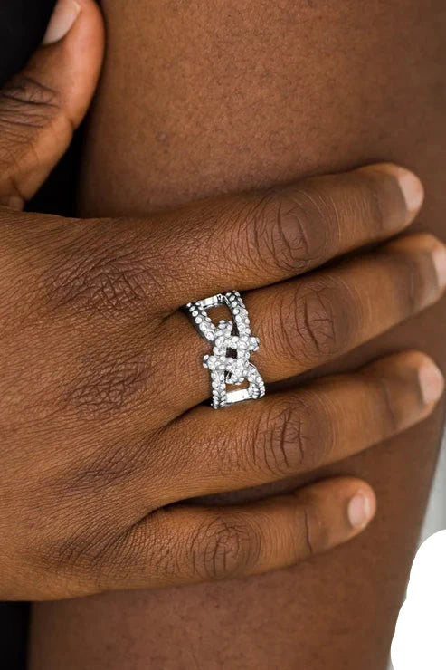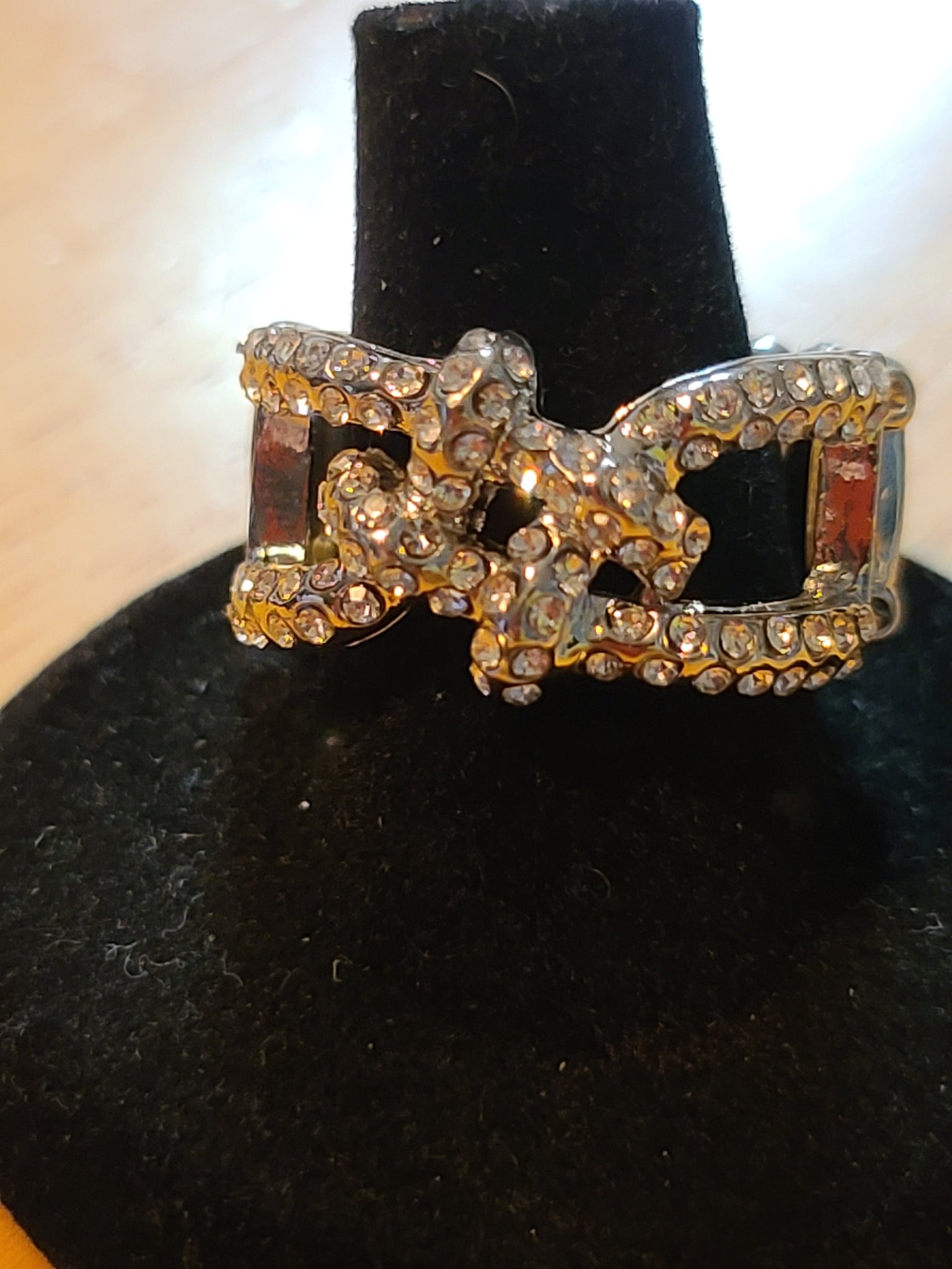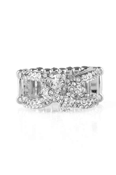 White rhinestones are sprinkled along silver knot. Features a stretchy band for a flexible fit.