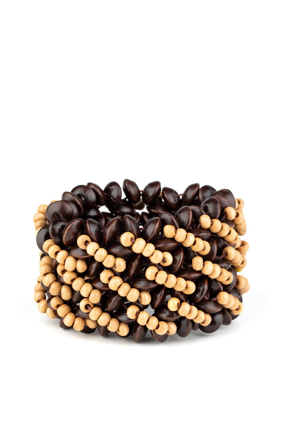 A collection of dainty tan wooden beads and brown wooden discs are threaded along knotted stretchy bands, creating a tropical floral pattern around the wrist.