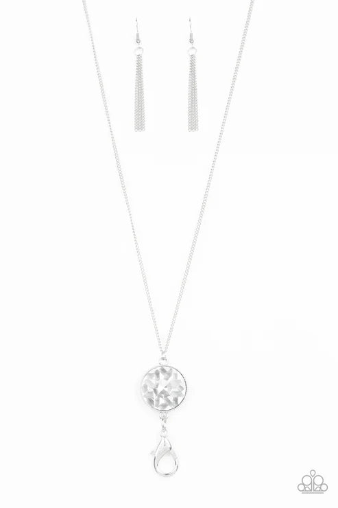 A collection of glassy and opaque white beads trickle down the bottom of a lengthened silver chain. Dotted with opalescent white rhinestones, a floral medallion-like pendant swings from the bottom for a whimsical finish. A lobster clasp hangs from the bottom of the design to allow a name badge or other item to be attached. Features an adjustable clasp closure.