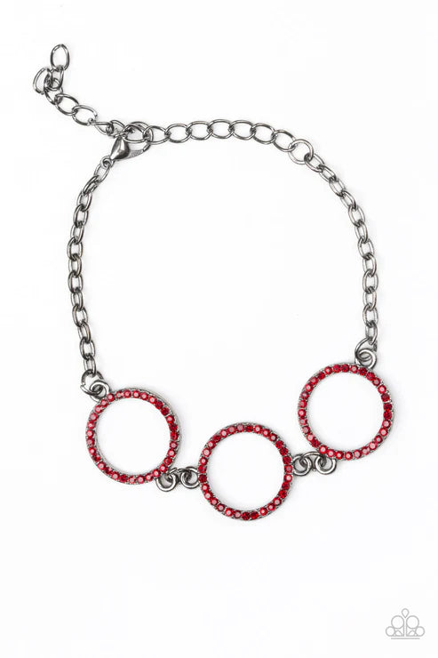 Encrusted in fiery red rhinestones, three glittery gunmetal rings link across the wrist for a glamorous look. Features an adjustable clasp closure.