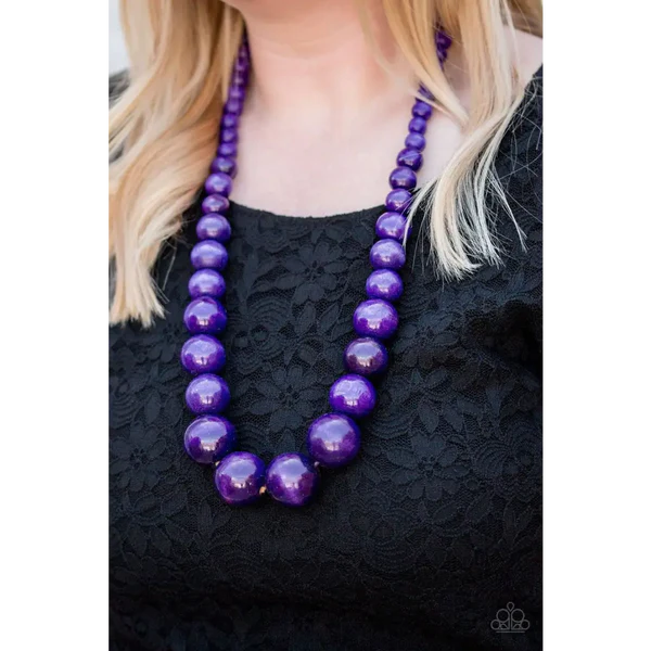 Gradually increasing in size near the center, vivacious purple wooden beads are threaded along a purple string for a summery look. Features an adjustable sliding knot closure.