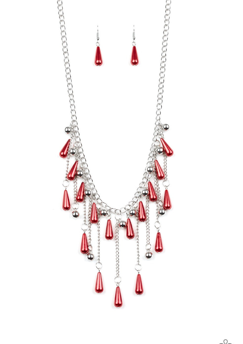 A fringe of shimmery silver and pearly red teardrop beads swings from the bottom of a glistening silver chain. Suspended by chains, matching beads dangle from the refined fringe for a gorgeous finish. Features an adjustable clasp closure.