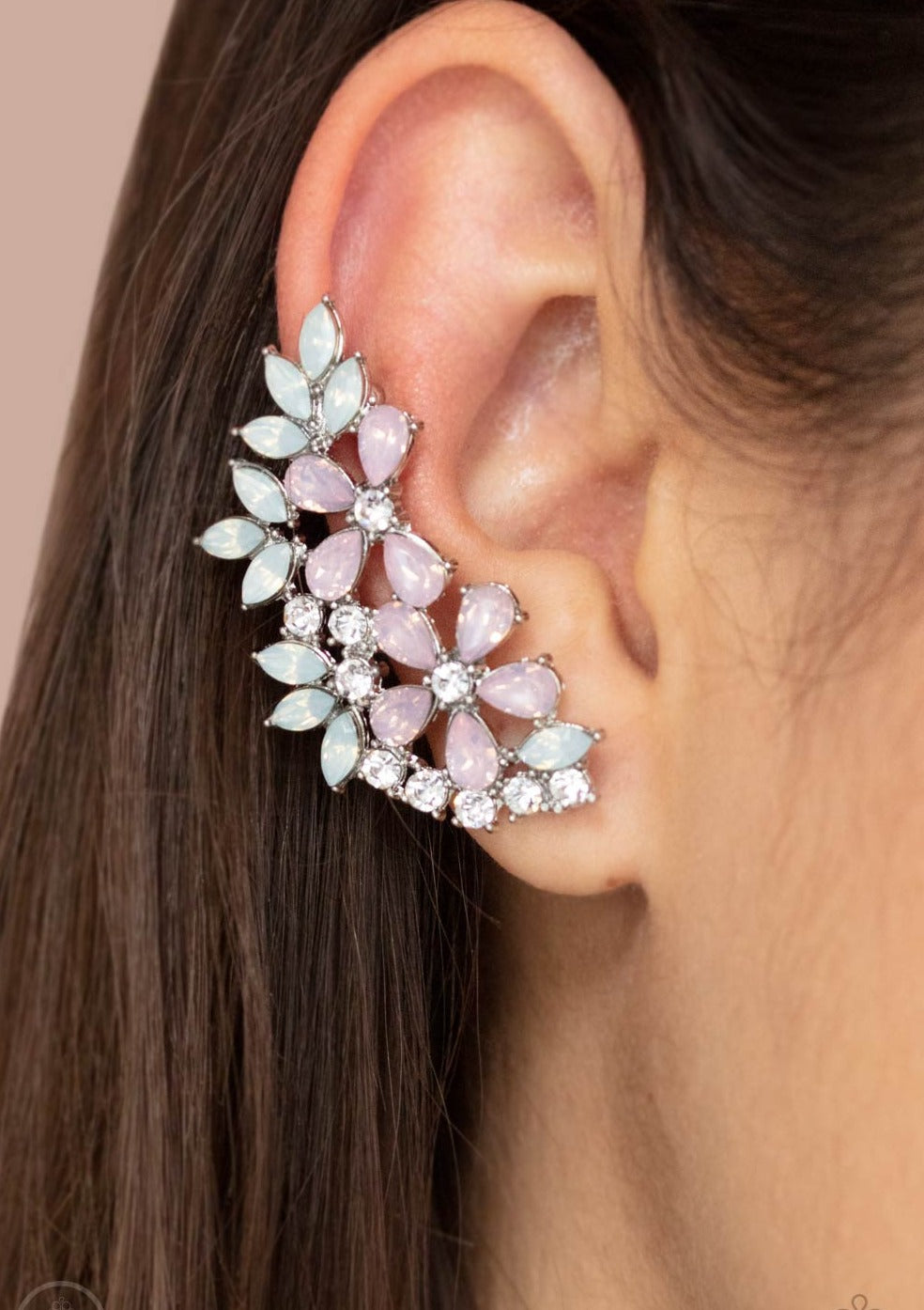 Featuring a milky opalescence, white marquise and pink teardrop rhinestones coalesce into a sparkly floral centerpiece that flawlessly climbs the ear. Earring attaches to a standard post fitting. Features a dainty cuff attached to the top for a secure fit.