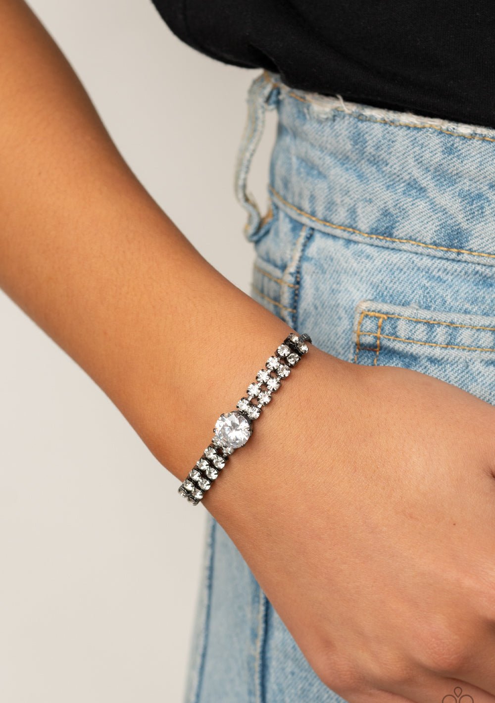 An oversized white rhinestone dots the center of two rows of glittery white rhinestones that attach to a dainty strand of gunmetal box chain around the wrist for a glamorous finish. Features an adjustable sliding bead closure.