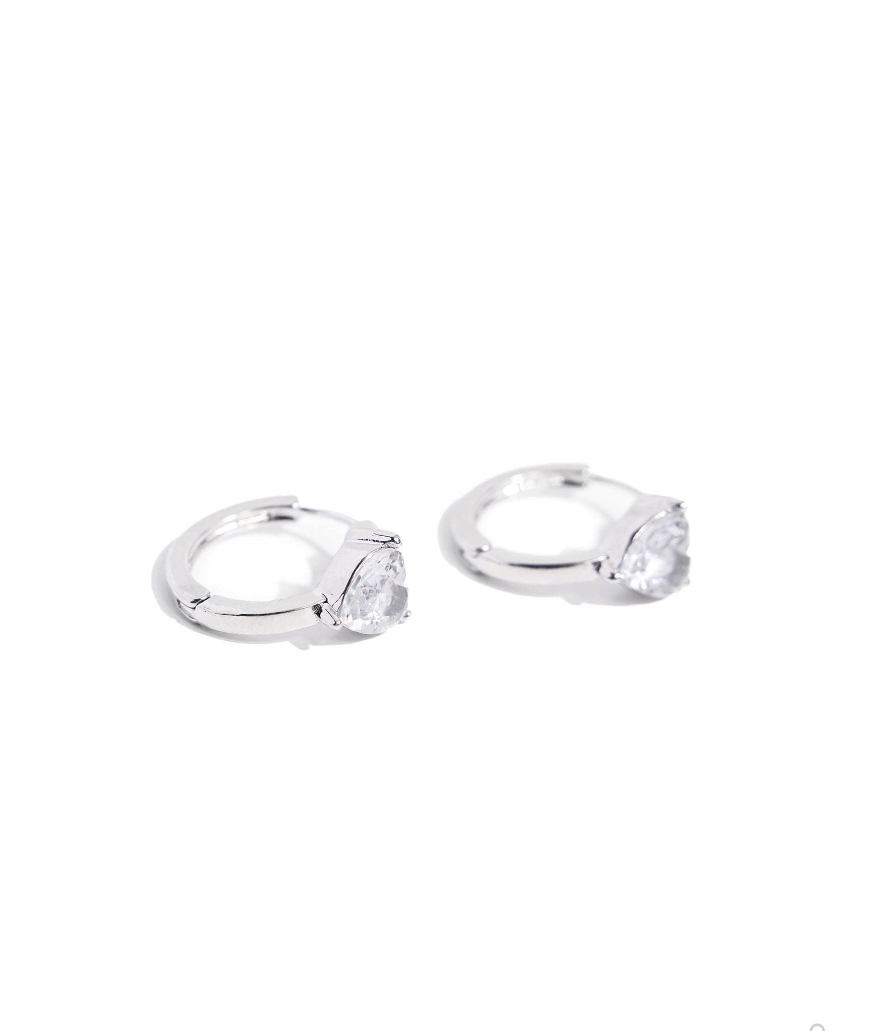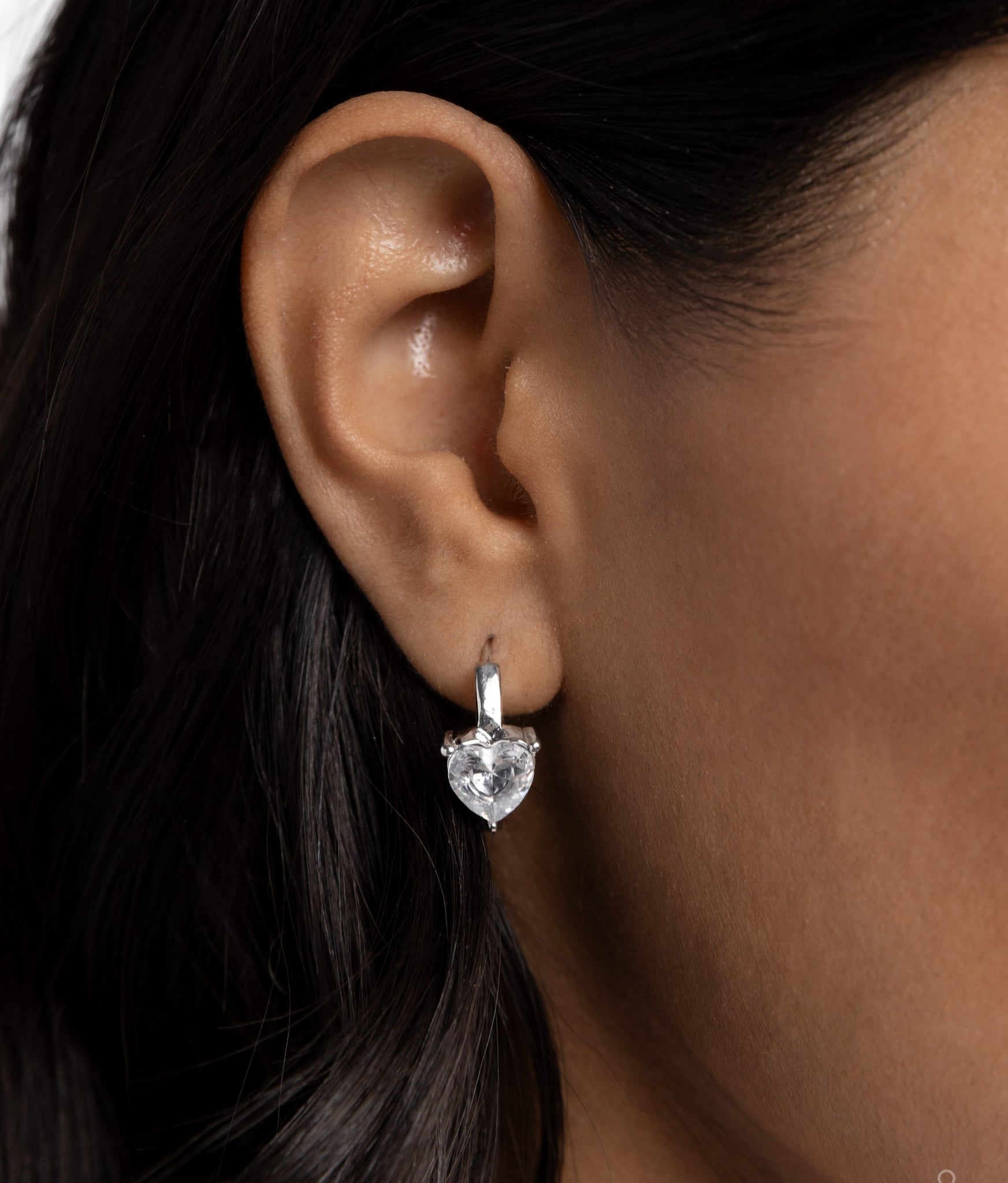 Pressed in an elevated fitting, a white heart gem glistens from a curved silver hoop for a romantic statement. Earring attaches to a standard hinge closure fitting. Hoop measures approximately 3/4" in diameter.
