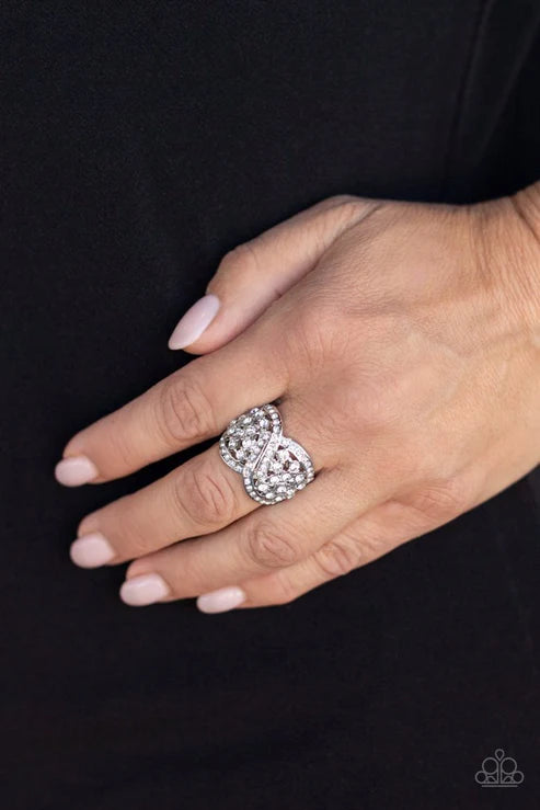 Intertwining white rhinestone encrusted silver bars delicately connect around clusters of glittery white rhinestones, creating a sparkly infinity across the finger. Features a stretchy band for a flexible fit.