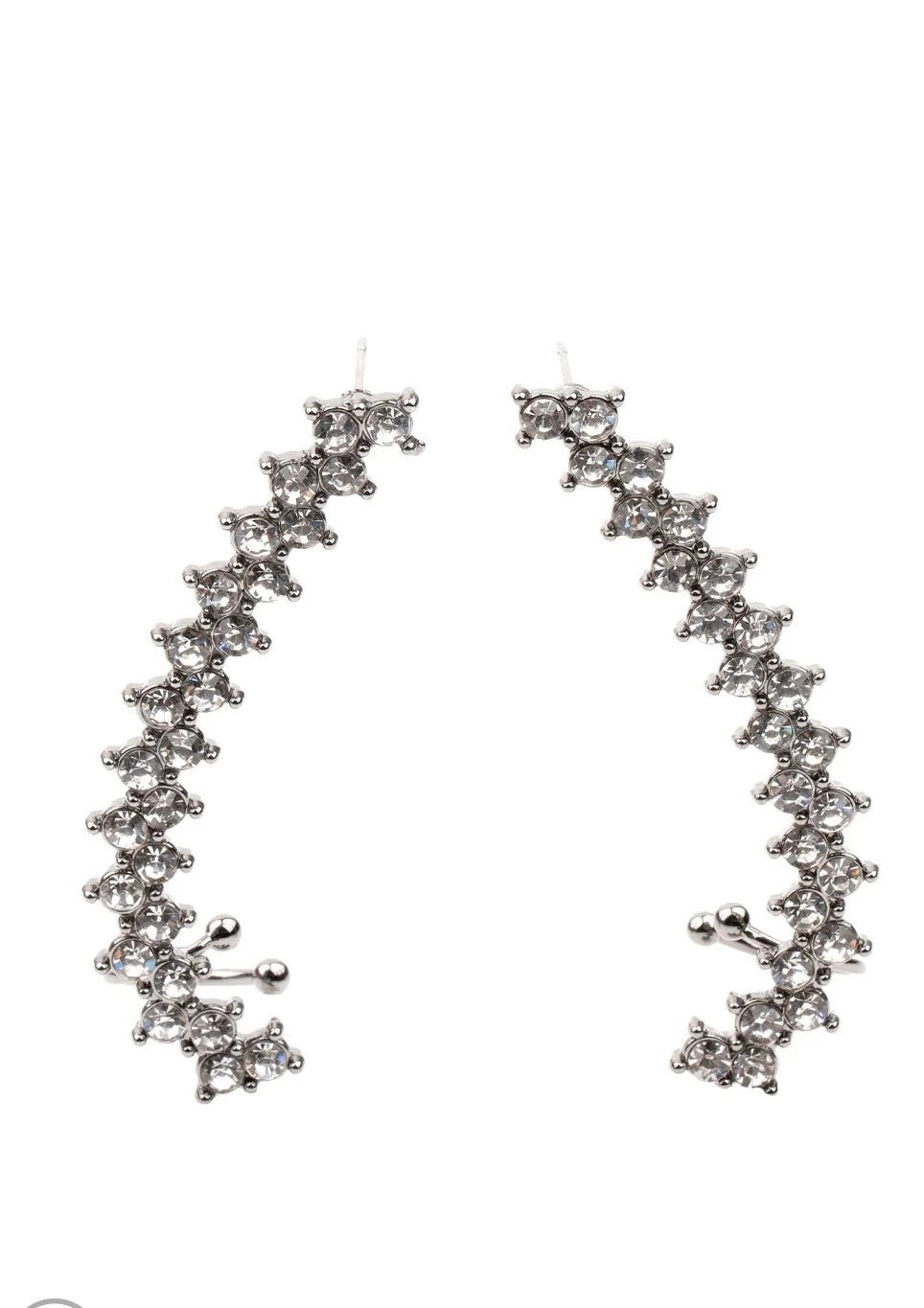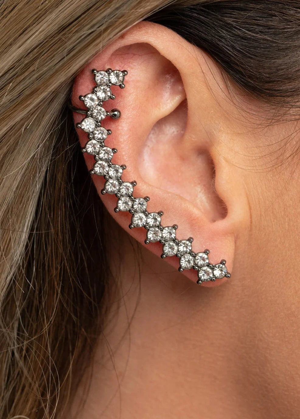 Encased in studded gunmetal fittings, pairs of glassy white rhinestones stack into a zigzagging frame up the ear for an electrifying fashion. Features a dainty cuff attached to the top for a secure fit.