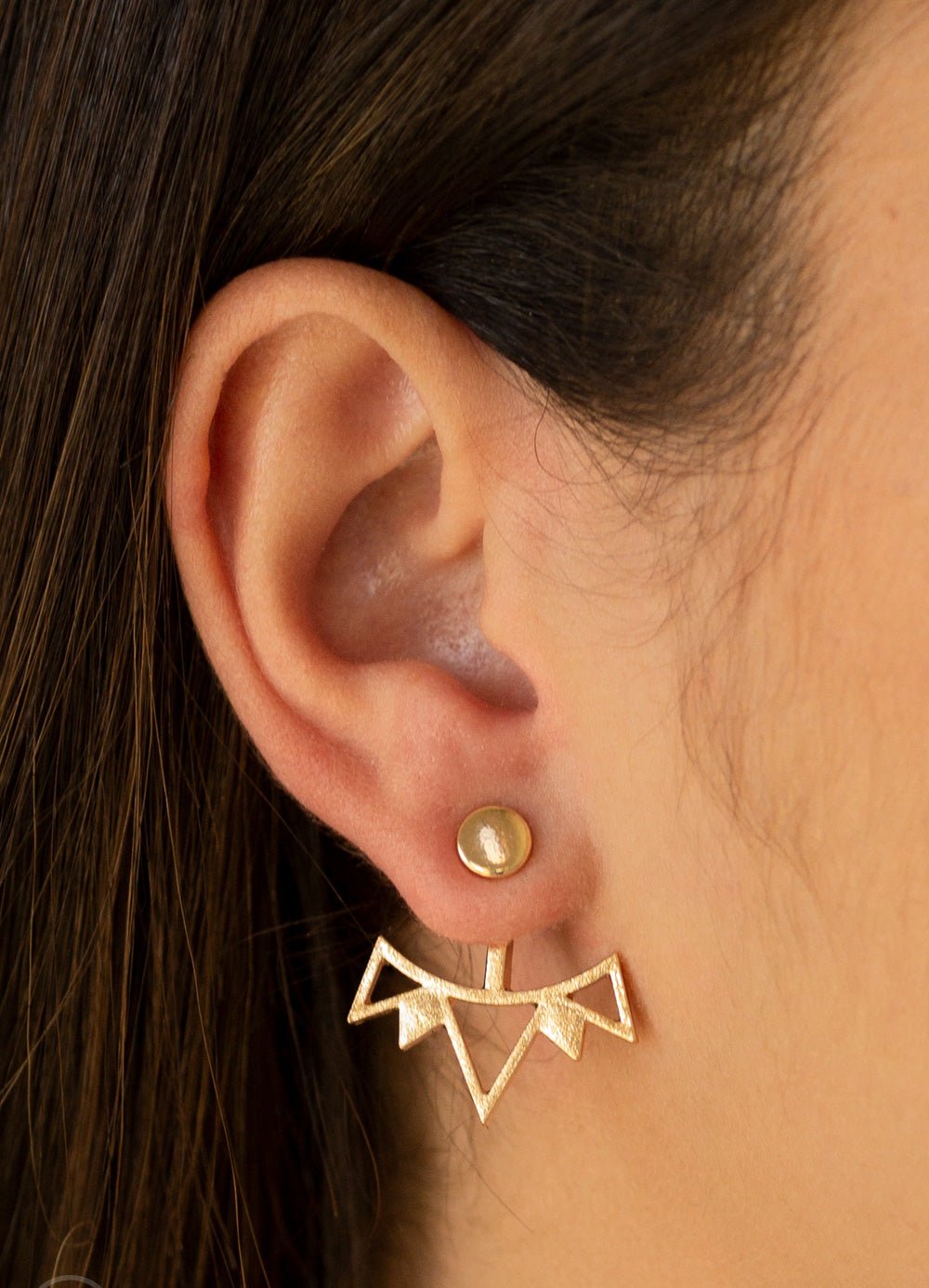 A solitaire gold disc attaches to a double-sided post, designed to fasten behind the ear. Brushed in a high-sheen gold finish, the geometric double sided-post peeks out beneath the ear for an edgy look. Earring attaches to a standard post fitting.