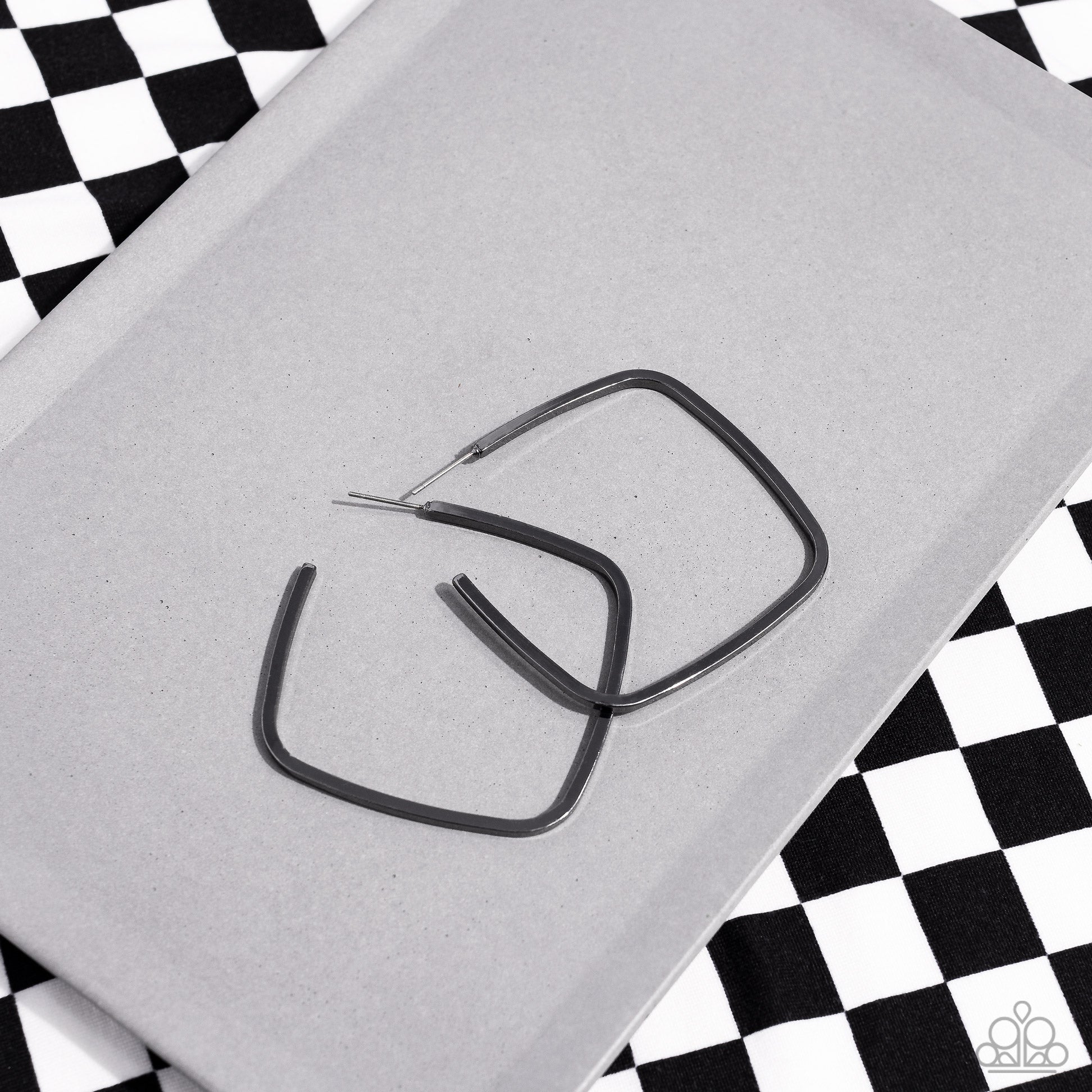 Featuring a high-sheen finish, a dainty gunmetal bar gently bends into a tilted cube-shaped hoop for an edgy allure. Earring attaches to a standard post fitting. Hoop measures approximately 2 1/4" in diameter.