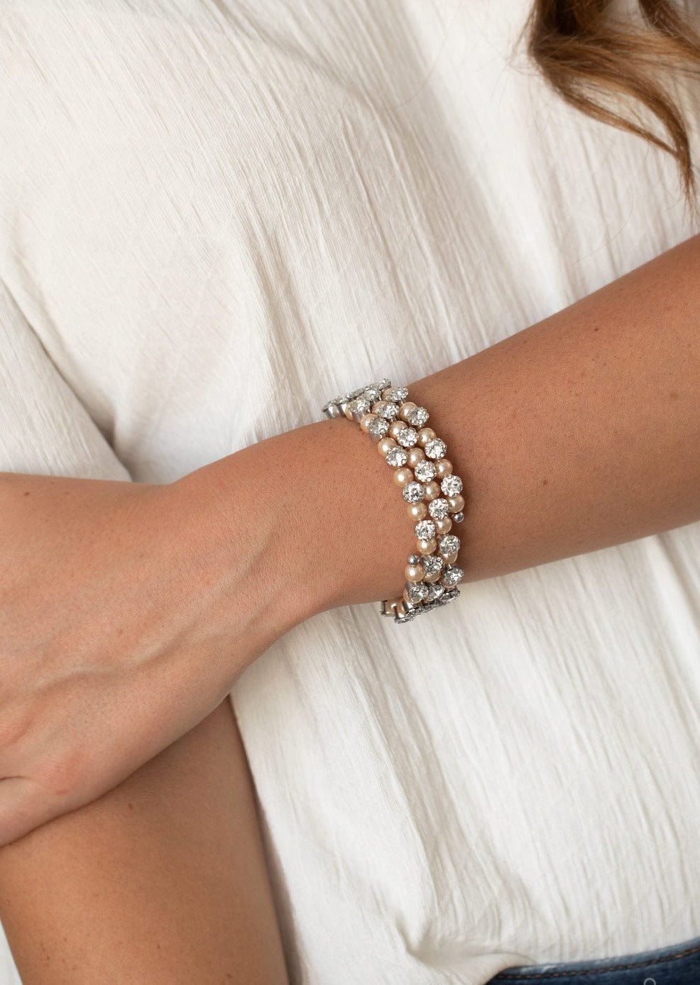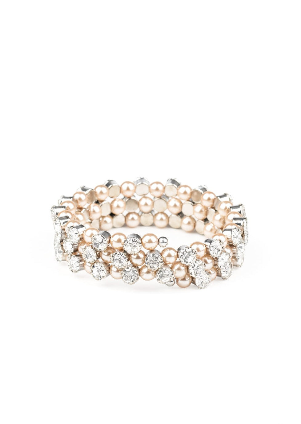 Glittery white rhinestones alternate with classy brown pearls along a coiled wire, creating an elegant infinity wrap bracelet around the wrist.