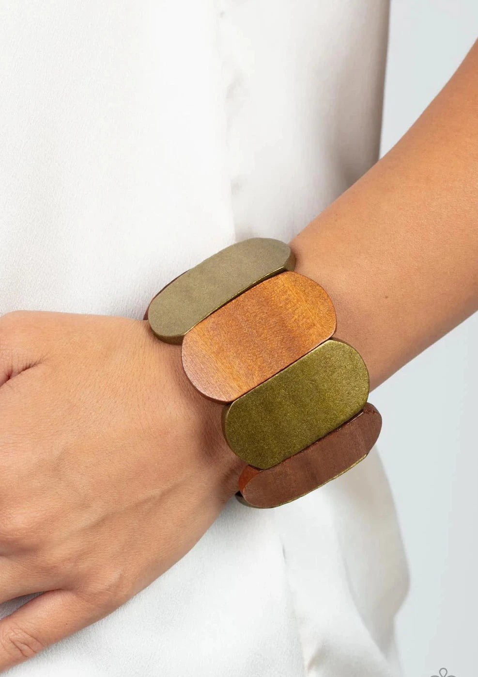 Brushed in a brassy shimmer, smooth wooden panels alternate with natural wood panels threaded along stretchy bands for a naturally balanced display around the wrist.