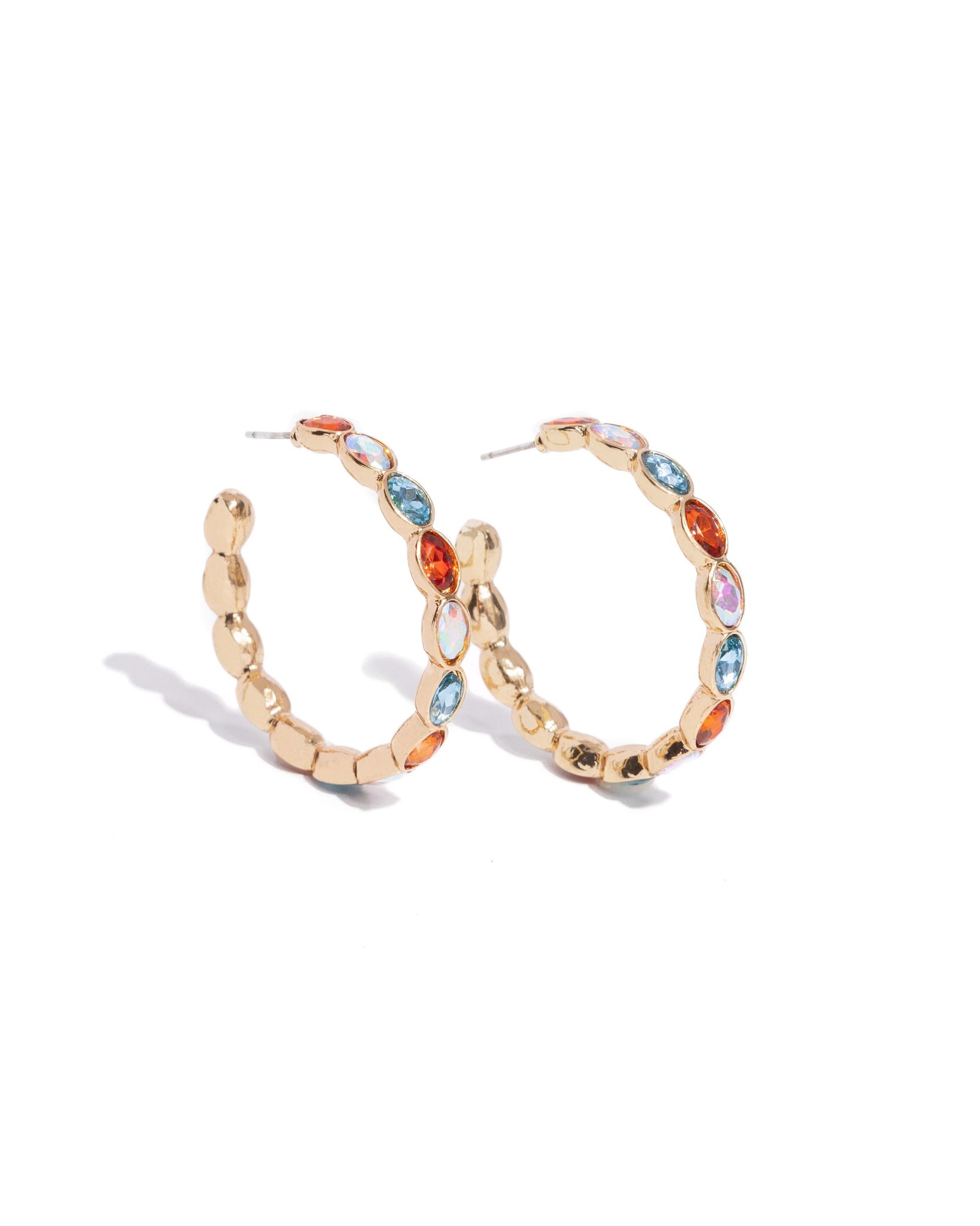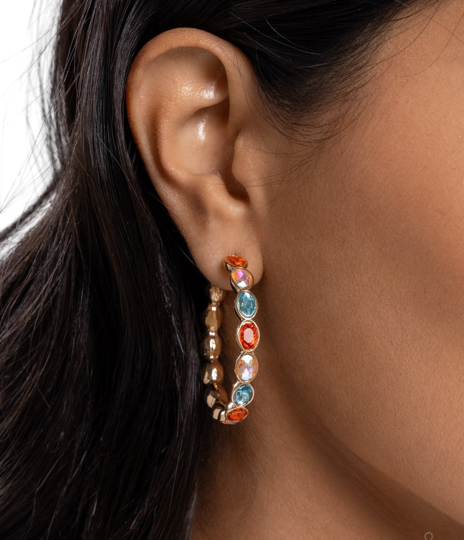 Featuring scalloped gold fittings, glittery multicolored and iridescent oval gems curve along the ear for a posh statement. Earring attaches to a standard post fitting. Hoop measures approximately 1 1/2" in diameter. Due to its prismatic palette, color may vary.
