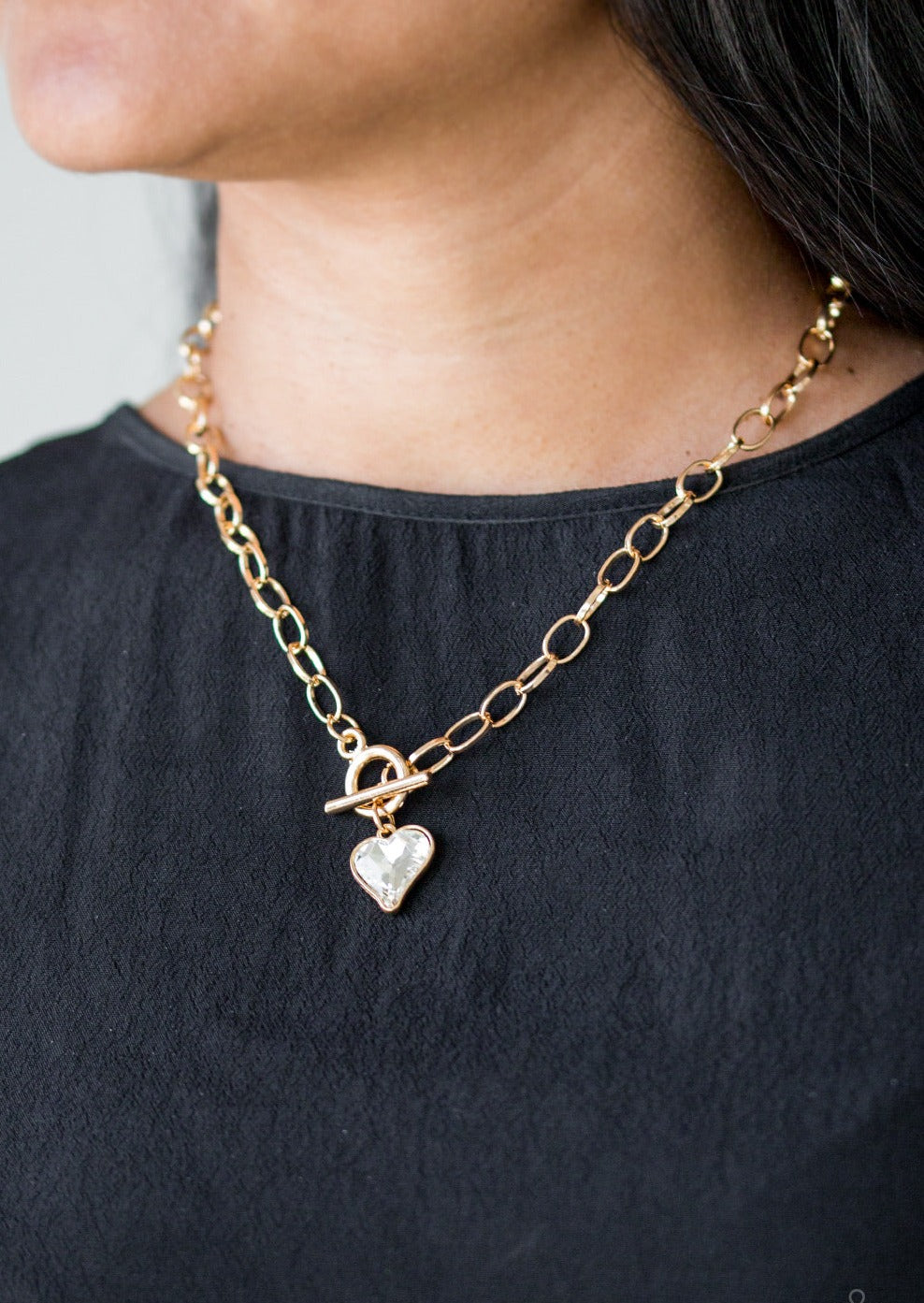 Cut into a whimsical heart shape, a glittery white gem swings from the bottom of a glistening gold chain below the collar for a charming look. Features a toggle closure.