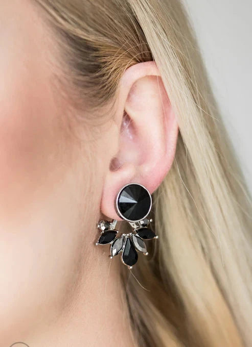 A dramatic black gem attaches to a double-sided post, designed to fasten behind the ear. Encrusted in a mishmash of glittery hematite and black rhinestones, the angular double-sided post peeks out beneath the ear for a bold look. Earring attaches to a standard post fitting.