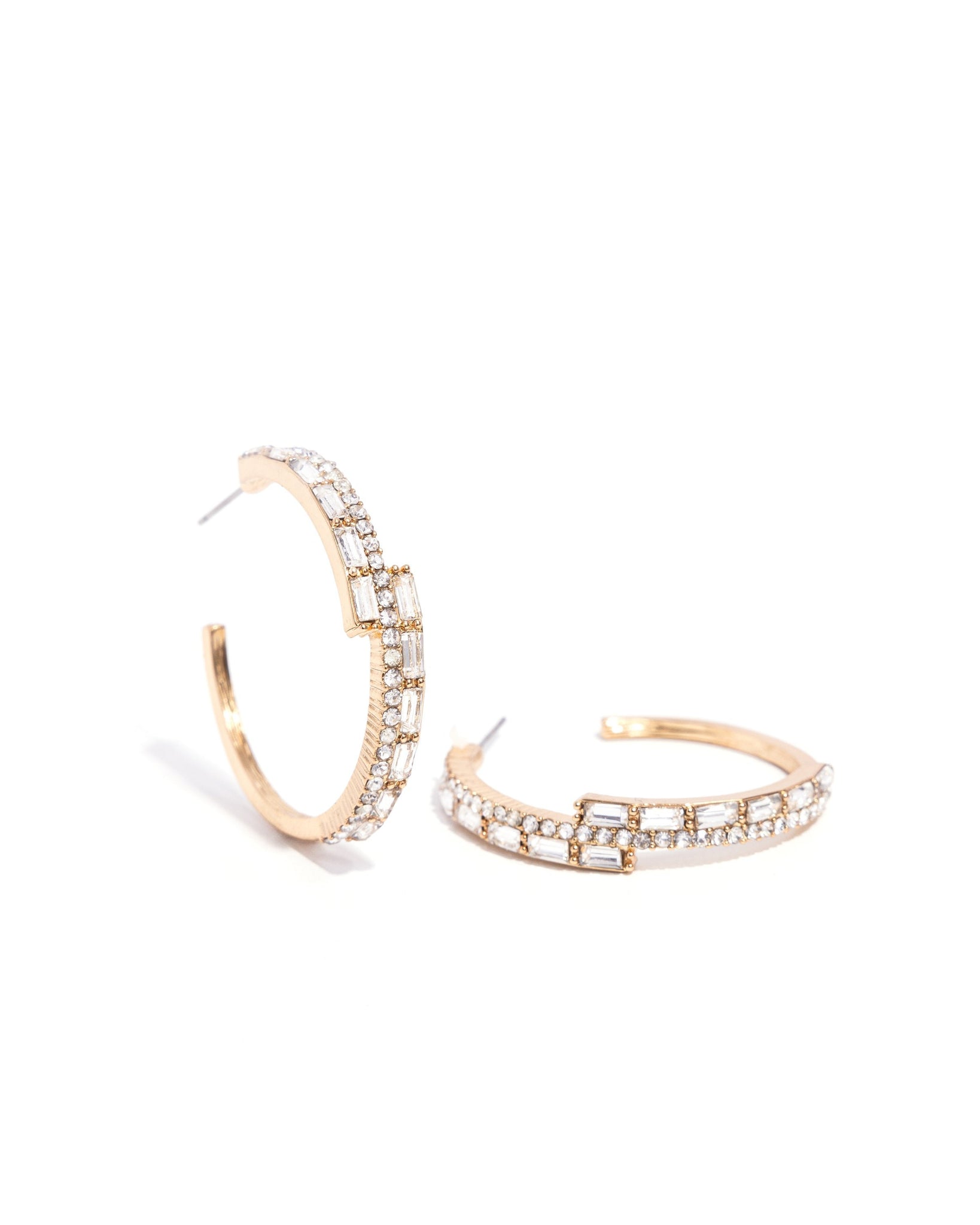 Infused with glistening white rhinestones a thin gold hoop encircles the ear. Pressed in gold-pronged fittings emerald-cut white gems delicately swoop asymmetrically along the gold hoop for additional glitz, completing the demurely layered look. Earring attaches to a standard post fitting. Hoop measures approximately 1 1/2" in diameter.