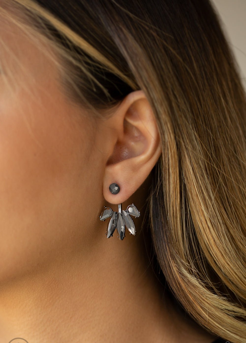 A solitaire hematite rhinestone attaches to a double-sided post, designed to fasten behind the ear. Featuring a fringe of regal teardrop and marquise style rhinestones, the glitzy double-sided post peeks out beneath the ear for a glamorous look. Earring attaches to a standard post fitting.