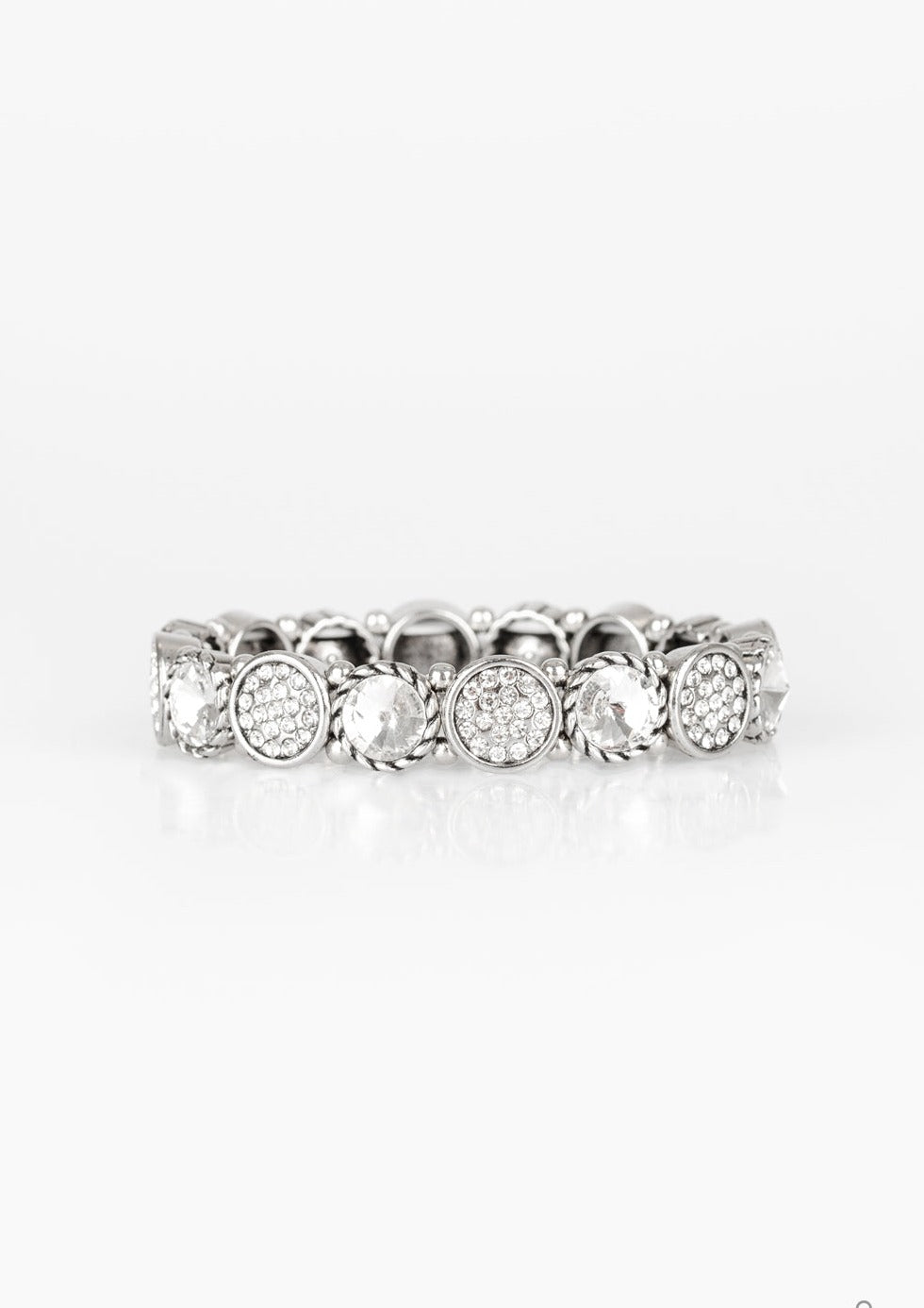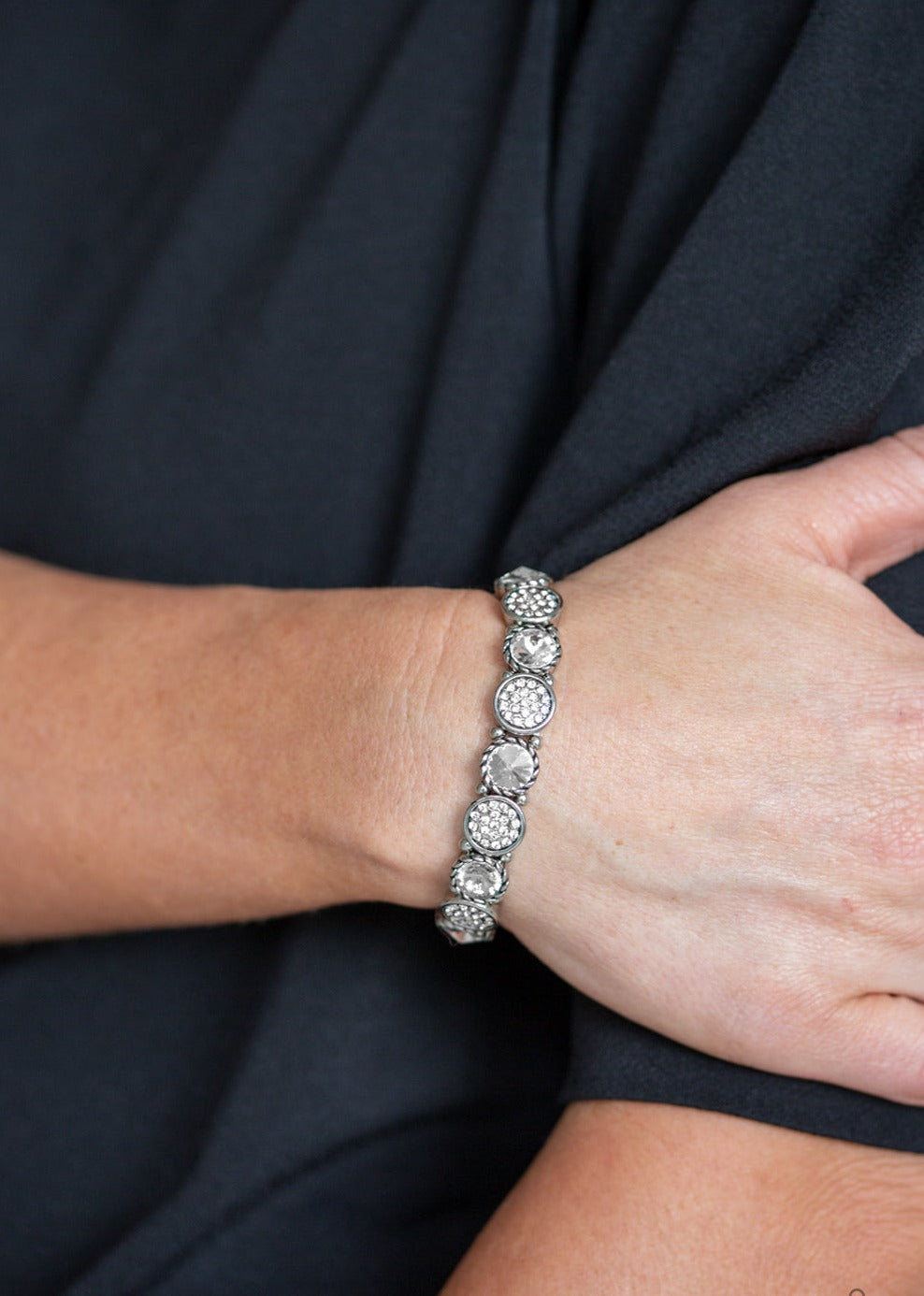 Featuring an array of glittery white rhinestones, mismatched silver frames and dainty silver beads are threaded along stretchy bands around the wrist for a glamorous flair.