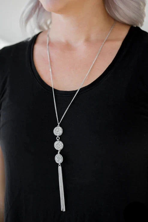 Sprinkled in glassy white and smoky hematite prism style rhinestones, three sparkling silver frames trickle down the chest. A shimmery silver tassel swings from the bottom of the triple stacked pendant for a glamorous finish. Features an adjustable clasp closure.