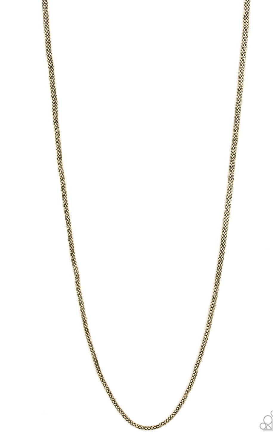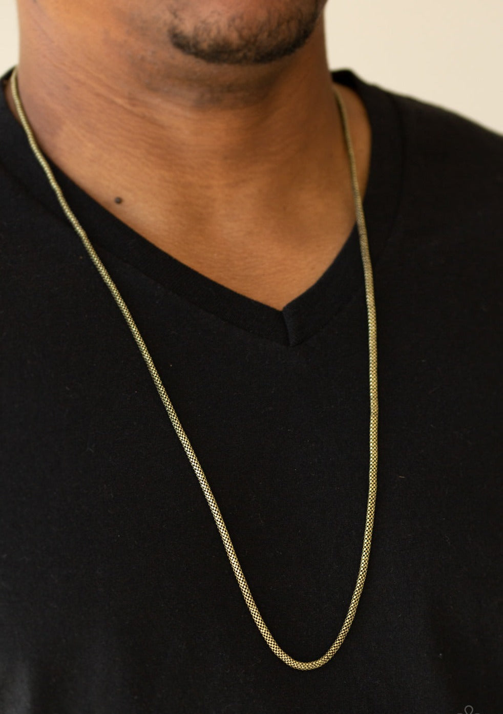 Brushed in a high-sheen finish, a shimmery strand of brass mesh chain drapes across the chest for a sleek look. Features an adjustable clasp closure.